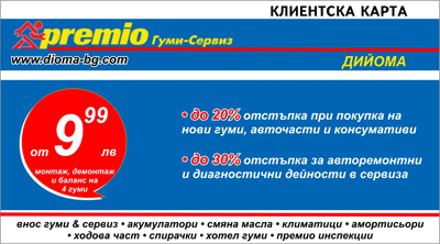 21.03.2012 08:30:50Вашата Клиентска карта ПРЕМИО може да получите в сервиза на ПРЕМИО – ДИЙОМА ВАРНА.
